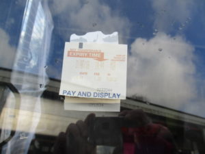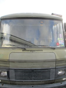 Nog een mooie afbeelding achter de voorruit van deze interessante legerbus. Als je goed kijkt kan je nog iets van een tekst lezen als “Pay and display”!