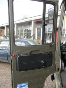 Op deze foto kan je het oude stuur goed zien. Ook kan je het oude dashboard van deze bijzondere legerbus/camper goed zien.