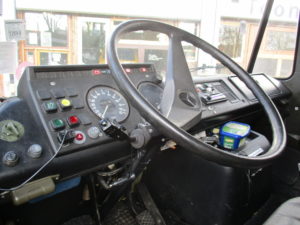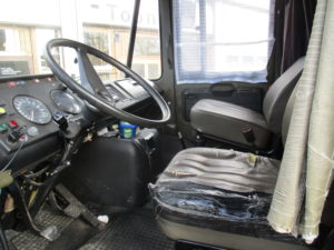 Op deze foto kan je het oude stuur en dashboard zien als ook de twee oude voorstoelen van deze bijzondere camper/legerbus.