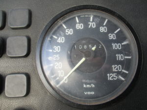 Een duidelijke foto van de oude snelheidsmeter van deze oude Mercedes bus.