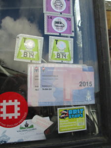 Een leuke foto van alle leuke stickers die zich achter de voorruit bevinden van deze leuke bus.