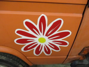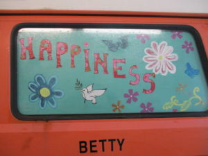 Nog een mooi “Happiness” decor is te vinden op dit Volkswagen campertje.