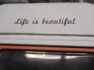 Een hele mooie spreuk in het Engels is te vinden op beide kanten van deze oldtimer.