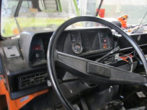Een foto van het oude stuur van deze oldtimer. Ook is op de achtergrond het oude dashboard nog gedeeltelijk te zien.