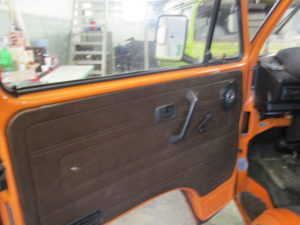 Een foto van het bruine interieur van één van de voordeuren van deze oldtimer.