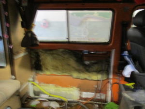 De achterbank van het Volkswagen busje ziet er nog redelijk goed uit.